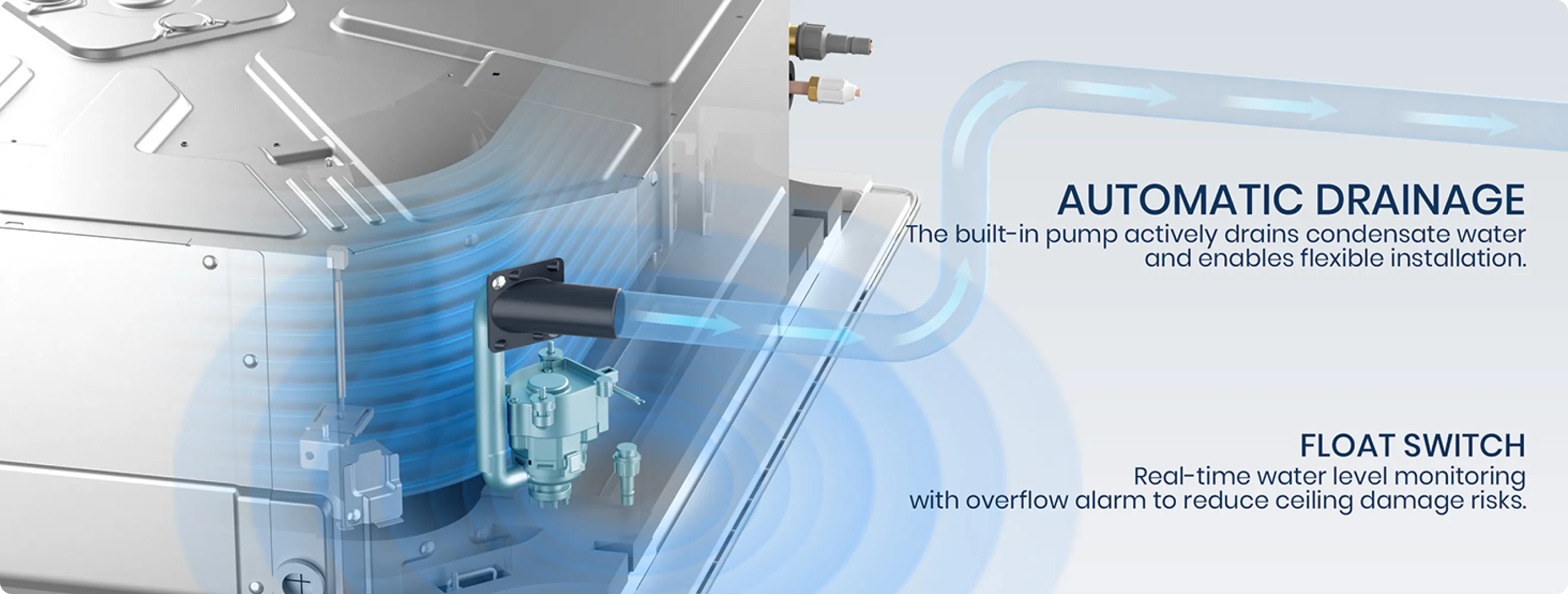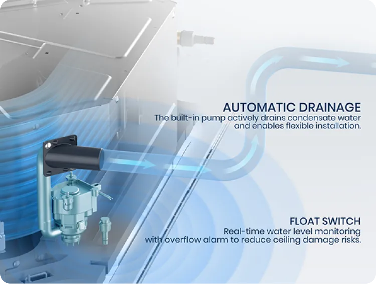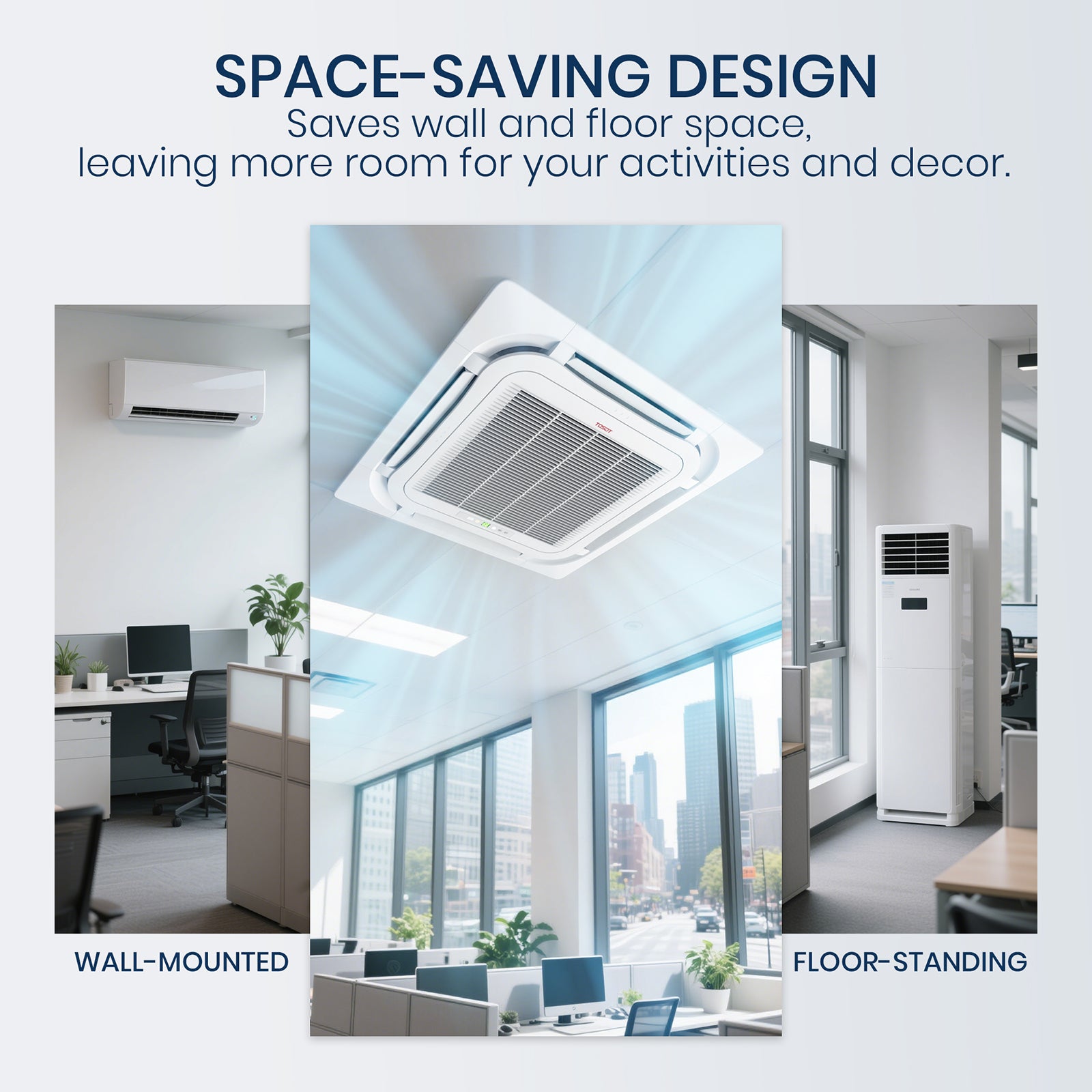 34,000 BTU ceiling cassette mini-split air conditioner delivers up to 1,071 CFM airflow; 6 fan speeds, including Turbo mode, ensure rapid temperature adjustment; operates in conditions from -13°F to 122°F