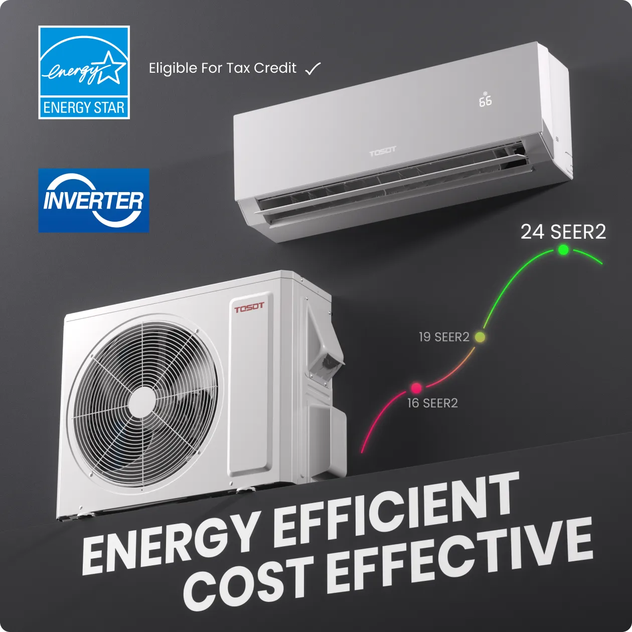 The TOSOT Aoraki Series mini split air conditioner offers energy-efficient cooling and heating with a SEER2 rating up to 24.5. Certified by ENERGY STAR and AHRI, it qualifies for tax credits.