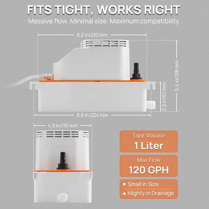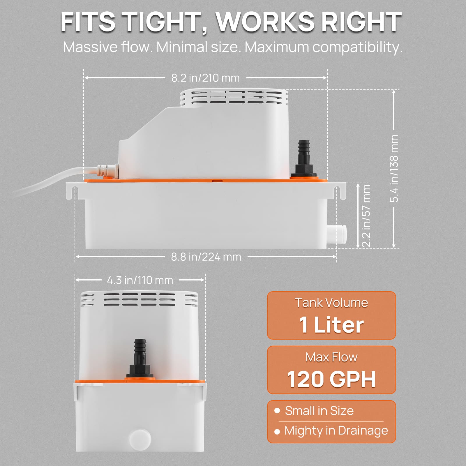 - High-Performance Drainage: Delivers maximum head of 26ft, up to 44% farther than standard pumps of 18ft; maximum flow of 120 GPH is 100% more powerful than models with 60 GPH; handles heavy condensate loads