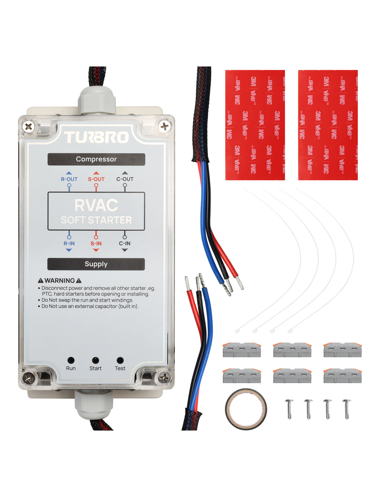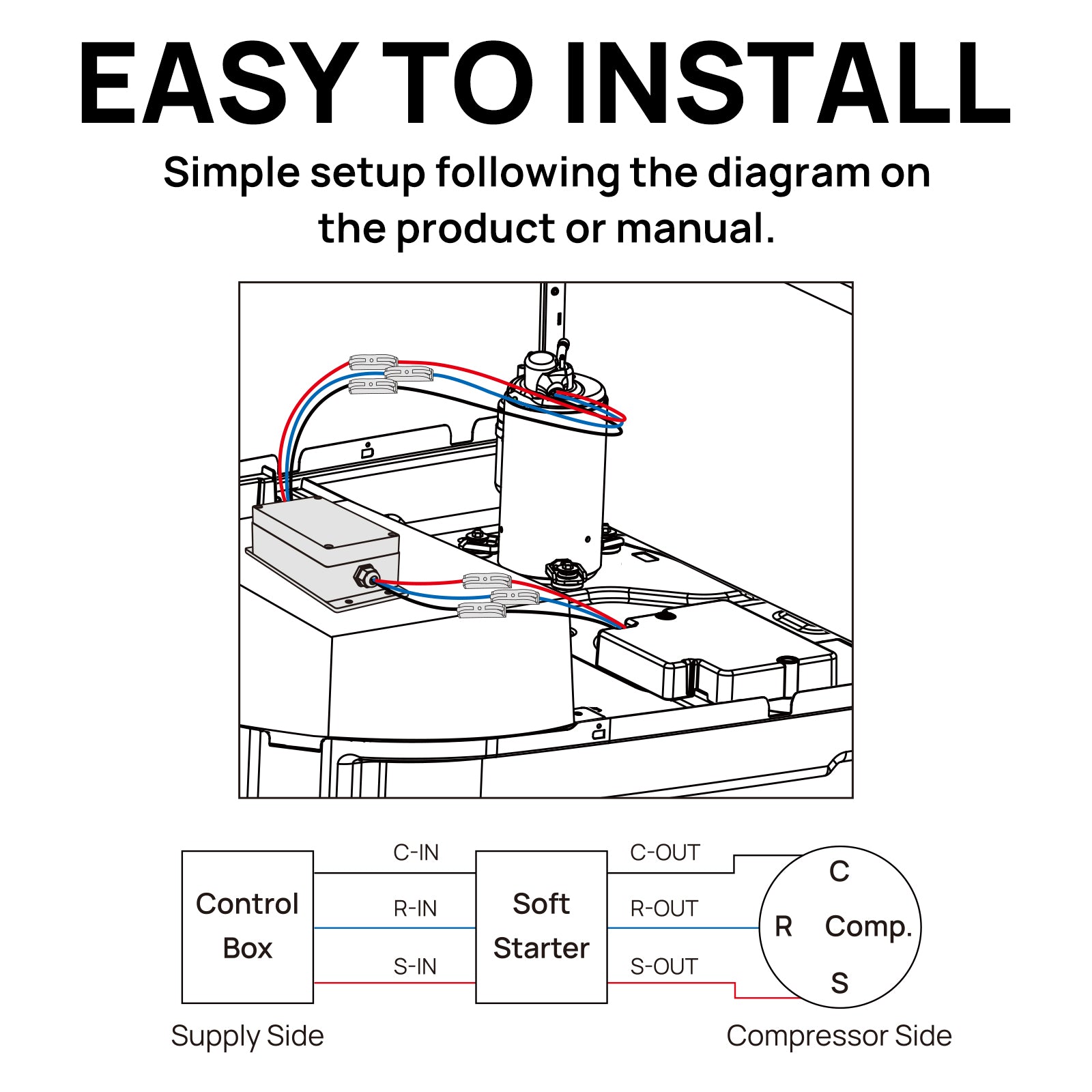 - Quick Setup: Easily connect the soft starter by disconnecting the compressor and control box harness and following the provided wiring diagram.