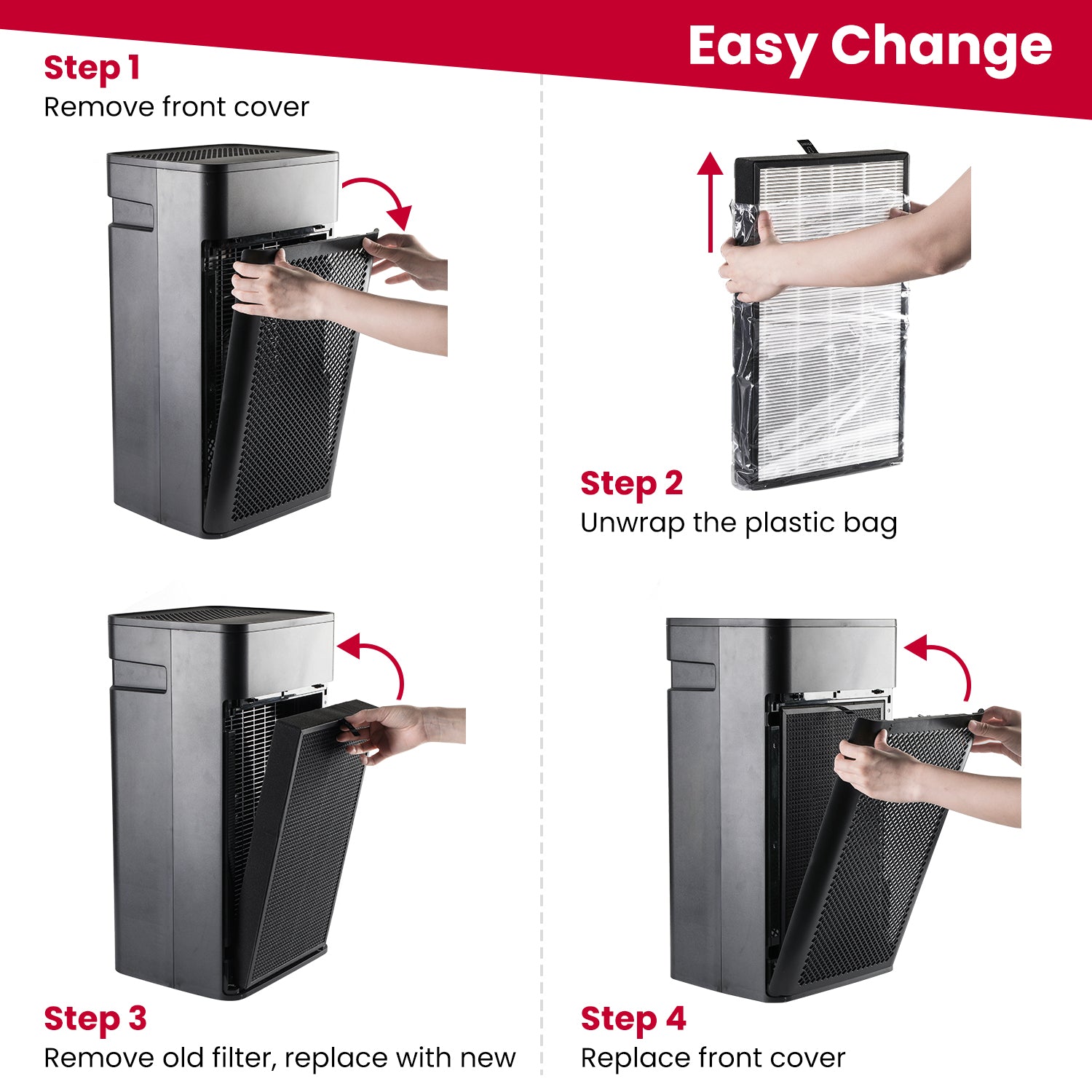 • Easy to Replace: Power off, open the front grille, remove the old filter, and insert the new replacement filter. After installation, press and hold the FILTER RESET button to reset the change filter reminder.